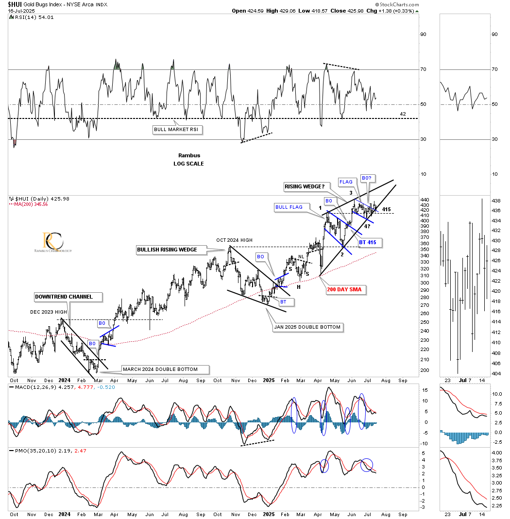 A quick look at the very short-term daily chart for the HUI shows the smaller rising wedge still in play, with a lot of sideways chopping action since the 3rd reversal point with 415 still helping with support.