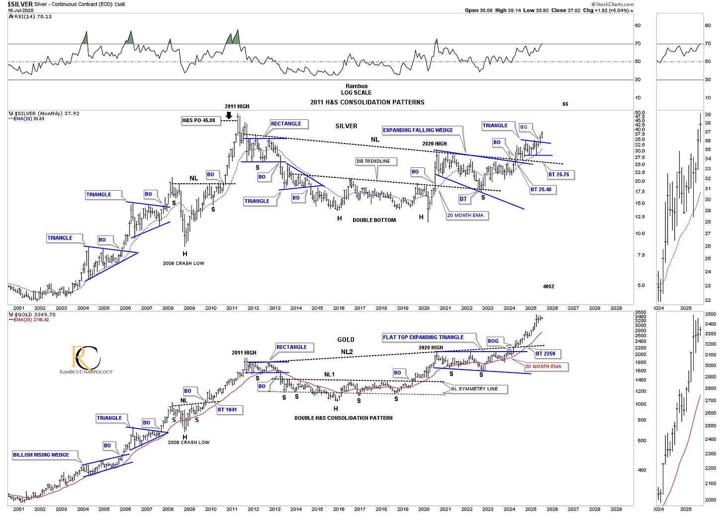 I would like you to focus on SLV, which has created a very bullish combo consolidation pattern, made up of the 2023 H&S consolidation pattern that we looked at above on the daily combo chart showing the H&S consolidation patterns, and the 2020 blue bullish expanding falling wedge. That precise combo consolidation pattern is the exact same consolidation pattern that gold formed at its 2008 crash low, which then led to the large impulse move to the 2011 all-time high back then before the bear market began.