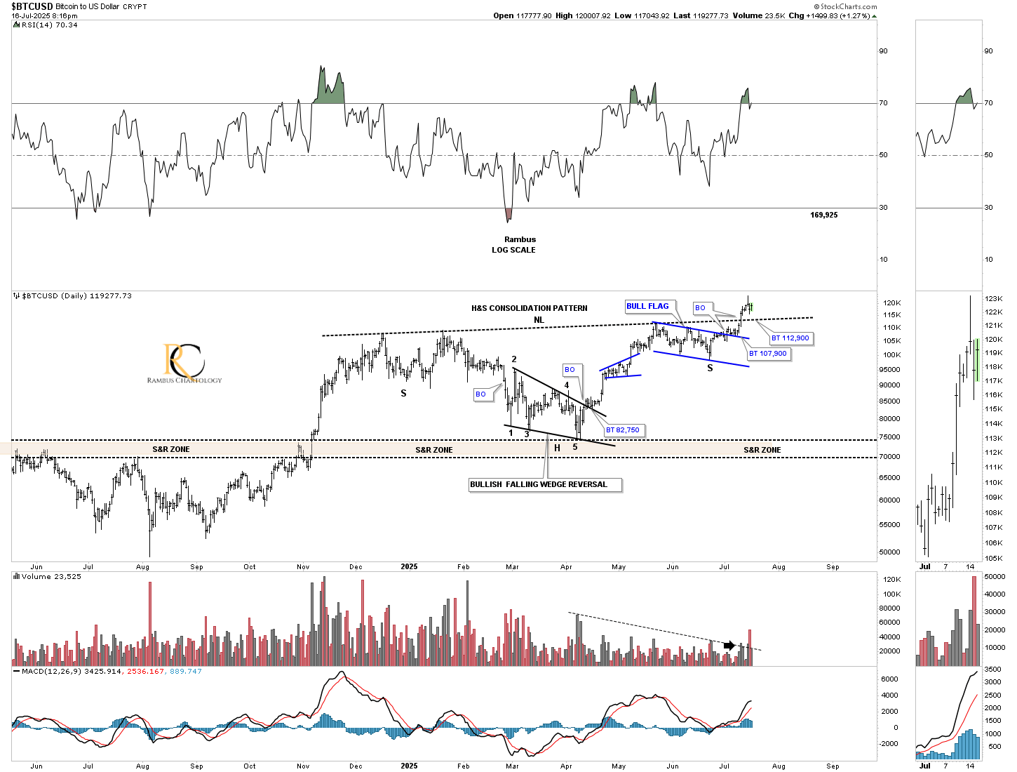 So far, we’ve looked at the nearly four-year H&S consolidation pattern, as shown on the daily combo chart above, and the 2020 blue bullish expanding falling wedge. This next monthly combo chart combines the 2023 H&S consolidation pattern and the 2020 blue bullish expanding falling wedge into one consolidation pattern, which is a very powerful setup.