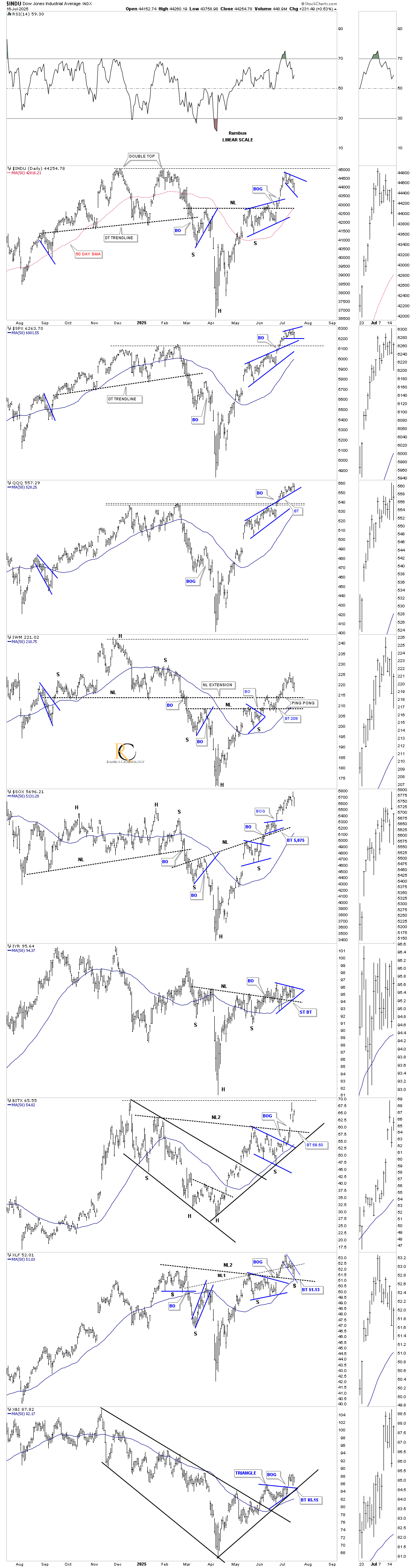 Below is a long-term daily combo chart, which shows the 2023 H&S consolidation pattern in most cases. We finally got the breakout above the neckline earlier this year, with most forming the small blue bull flag as the backtest. Most of these H&S bottoms are pretty symmetrical, as shown by the neckline symmetry line, which gave us an area to look for the right shoulder low. You can also see that many of the H&S are a little unbalanced, with two left shoulders and one right shoulder.