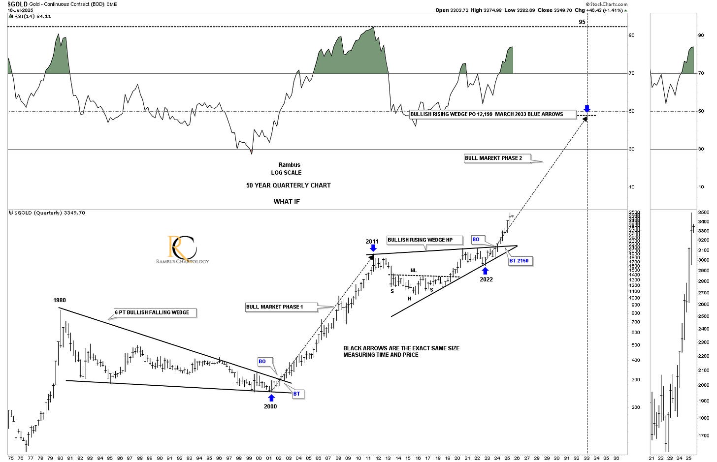 Since the 2011 high, gold formed its 2011 bullish rising wedge, which I’m calling a halfway pattern to the upside. Since the last reversal point in the 2011 bullish rising wedge, the angle of the bull market is the same as the 2000 to 2011 bull market rally, long black arrows. Keep in mind, we’ve been following the breakout move while the price action was still trading inside of the 2011 bullish rising wedge, so again, the Chartology is playing out beautifully.