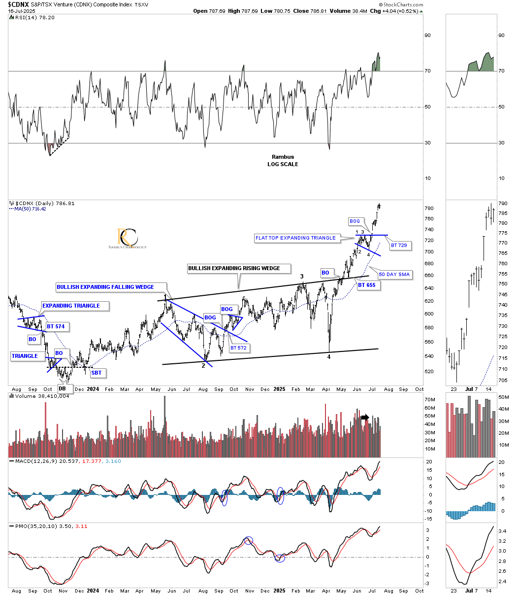 From this short-term daily chart perspective, the CDNX is still impulsing higher after a slight pause to refresh, forming the small blue flat-top expanding triangle.