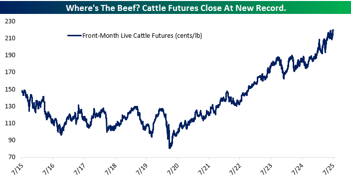 Beef prices continue to sizzle. Live cattle futures just closed at a new all-time high, climbing to $2.20 per pound after a multi-year rally that’s been quietly unfolding since mid-2020. While inflation has cooled in many parts of the economy, the beef market remains red-hot, driven by a combination of shrinking cattle herds, ongoing drought conditions in key ranching states, and steady consumer demand for beef across both retail and food service channels.