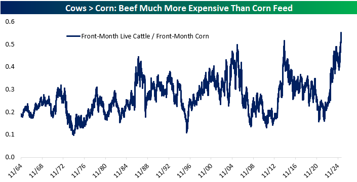 What makes this even more striking is how cheap corn, the primary feedstock for cattle, has remained in relative terms. A long-term chart of the cattle-to-corn ratio shows that beef has never been this expensive relative to feed costs, with the spread hitting its highest point in over six decades. For cattle producers, this is an extremely favorable setup: high output prices and low input costs translate into wide margins.