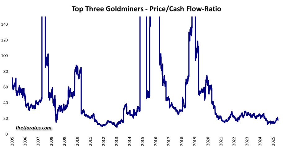 The price-to-cash flow ratio (P/CF) is more meaningful, as it excludes special balance sheet effects and value adjustments. It shows how much investors are willing to pay for a company’s actual cash flow – and thus whether Gold mining stocks are considered expensive or cheap in the market. If the price of Gold falls significantly, margins shrink and the ratio shoots up. Then the stocks appear expensive, even though their prices have usually already fallen noticeably.