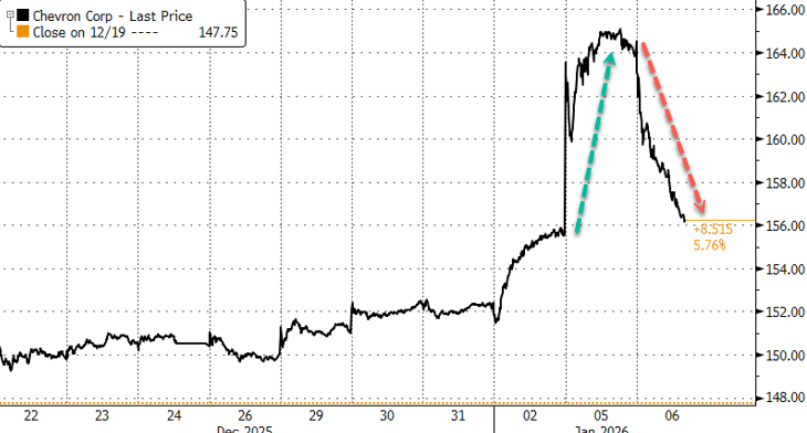 On Monday, shares of Chevron, ConocoPhillips (COP), and ExxonMobil (XOM) jumped on news of regime change in Venezuela. However, Chevron shares had given up most of those gains by late trading on Tuesday.