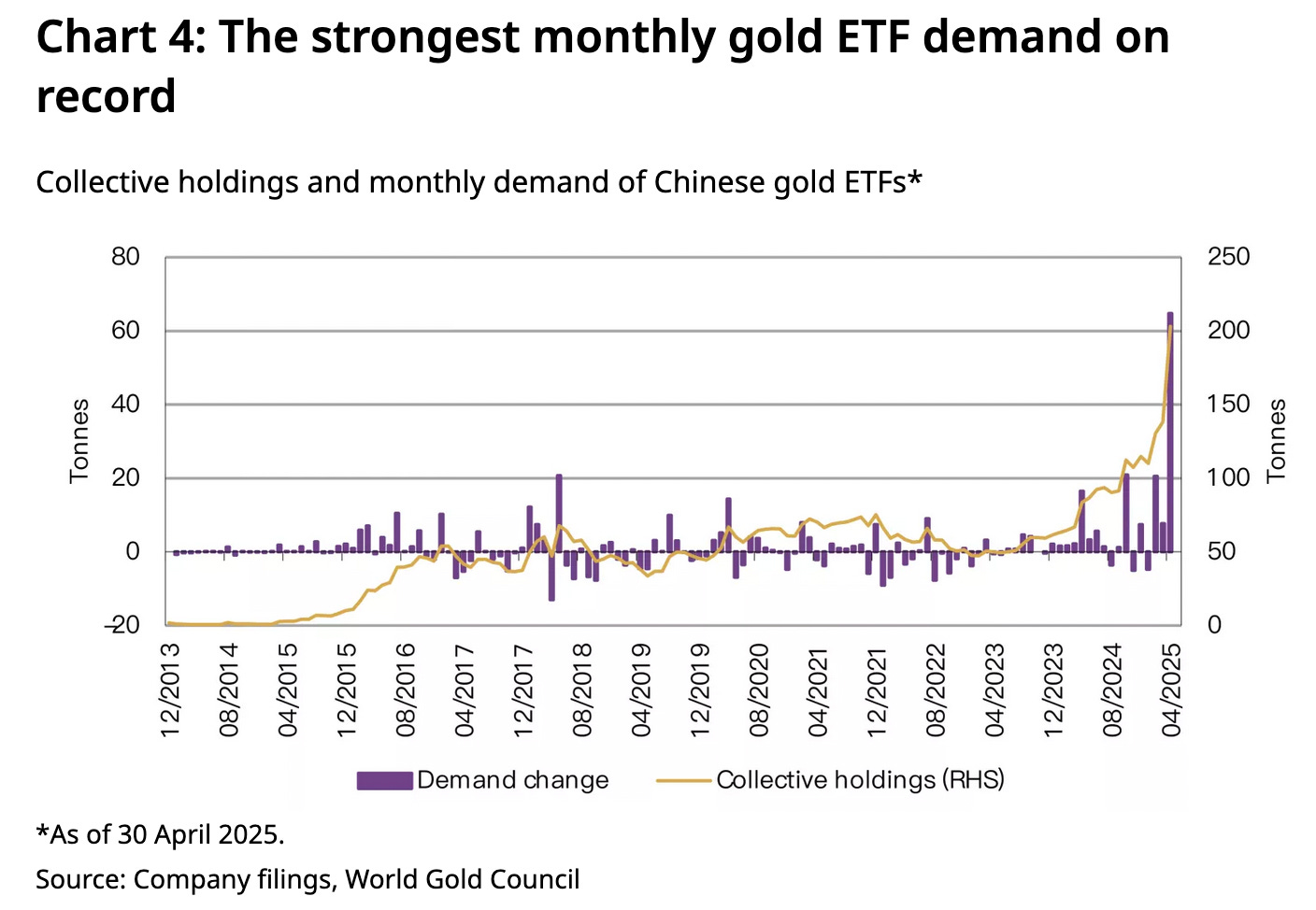 During the first four months of 2025 Chinese gold ETFs’ total AUM and holdings have jumped by 125% and 77%, respectively.