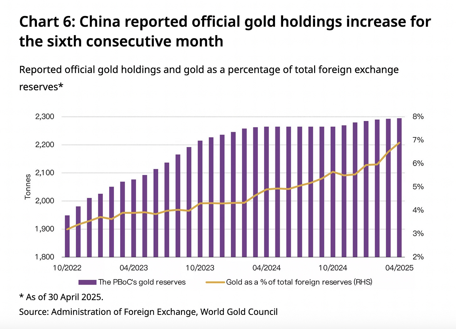 So far in 2025 China has announced an increase of 14.9t in its official gold holdings.
