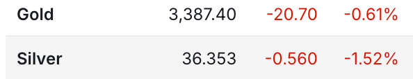 Both gold and silver were down on Thursday, with the gold futures down $21 to $3,387, and the silver futures down 56 cents to $36.35.
