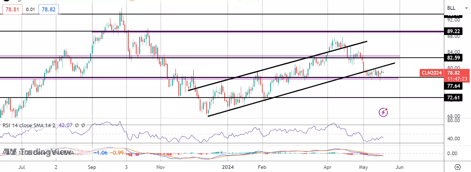 Following the heavy sell off on May 1st, oil prices have been muted over the month so far with crude futures settling into a tight range. Price have been caught between support at 77.64 and the underside of the broken bull channel. Hopes for a ceasefire between Israel and Hamas had been a big driver of the weakness into the start of the month with traders optimistic that an end to the fighting could be achieved. However, with no deal agreed and the violence still without resolution that downside momentum has subsided for now.