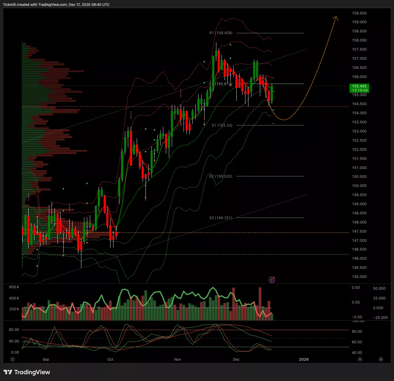 - Below 155.36 Target 154.59