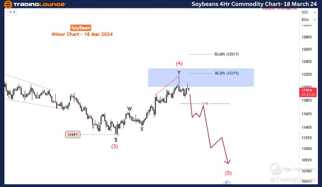 Examining the daily time frame, it becomes apparent that Soybean has been undergoing a prolonged bearish correction since June 2022. Corrections typically manifest in three distinct legs, denoted as A, B, and C. Wave A circled in blue, concluded with a diagonal pattern in October 2023, when Soybean was traded at $1251. Subsequently, wave B unfolded, exhibiting a shallow retracement of just over 23.6% Fibonacci ratio of A, culminating on 15th November 2023 for $1399. Following this, prices descended further as wave C commenced its progression. Notably, wave C is evolving through a five-wave impulse pattern, currently in the process of completing wave (4). Upon the completion of wave (4), wave (5) is expected to perpetuate the downward trajectory, finalizing wave C. The main question at this juncture pertains to whether wave (4) has indeed reached completion, a question that warrants scrutiny of the sub-waves within (4) on the H4 time frame.