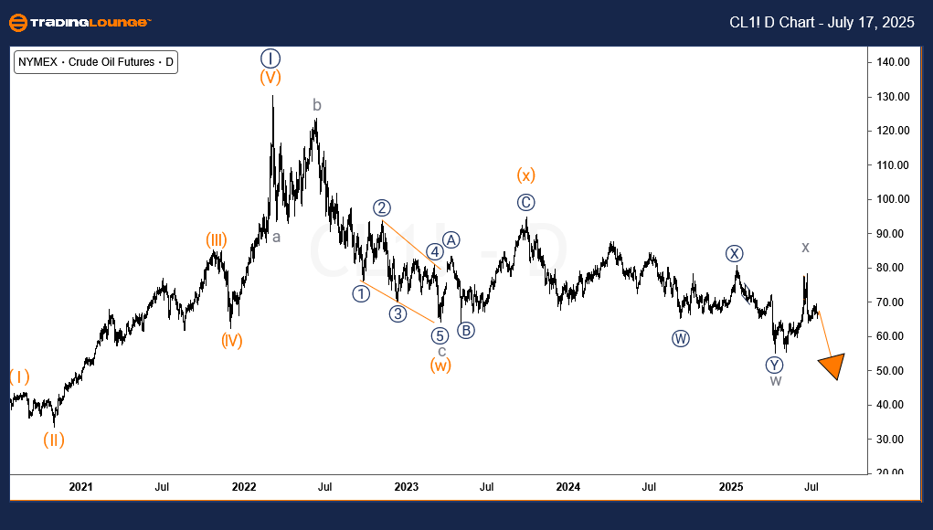 WTI Crude Oil is expected to extend its decline after completing a minor bounce that ended around June 22, 2025. The broader outlook remains bearish, with the current structure indicating that the commodity is still within a long-term corrective phase that began in March 2022. As the structure remains incomplete, the downside bias continues with targets below $50.