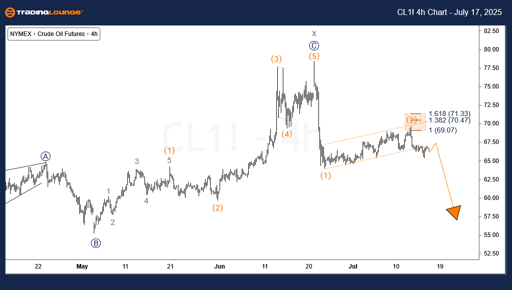 The H4 chart reveals further short-term bearish structure. WTI appears to have completed waves (1) and (2) of ((A)) of wave y. As long as the price remains below the $69.7 level (wave (2) high) and more significantly, under $78.4 (wave x high), selling pressure is likely to dominate.