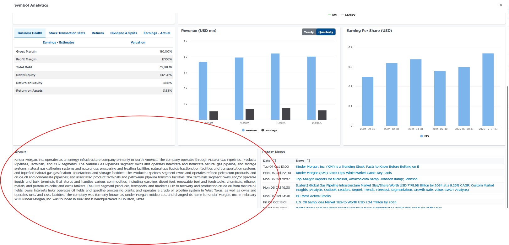 To help us identify natural gas pipeline stocks that may be of interest, we can utilize the SimpleVisor Screening Tool. The second graphic below shows the screening tool and a quick screen we made. The red rectangle highlights the six categories and their respective thresholds that we chose for our screen. Unfortunately, we can only screen the entire energy sector and not just pipeline companies. Thus, once we come upon a roster of potential stocks, we gave each company a scan to see which were primarily natural gas pipeline companies. To do this, we click on the tickers, and a summary pop-up page opens. This page provides the following: company overview, chart, fundamentals, short interest, insider statistics, option chains, technical studies, and recent news. The third graphic from the overview tab provides a summary of what Kinder Morgan (KMI) does.