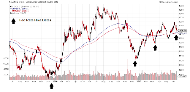 If you look at the four rate raises so far in our current cycle, we see that you are hard pressed to find a guru or algo that predicts gold climbs any better. If you were a newsletter with this track record, you could sell a zillion subscriptions. Note that the arrows all fall on an ascending trend since the first one in late 2015. As the above chart shows, there is typically a decline in gold leading into a much talked about FOMC meeting where everyone has come to expect a rate increase. This weakness also lasts a couple weeks or so after the fact, then a vigorous climb ensues.
