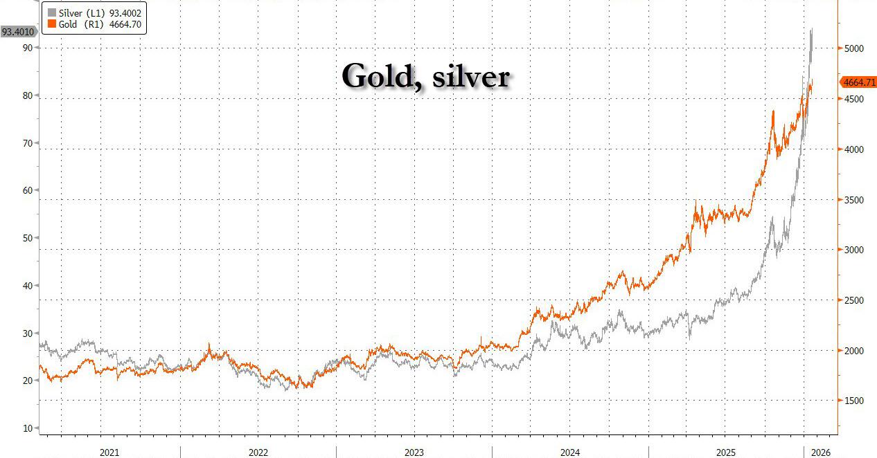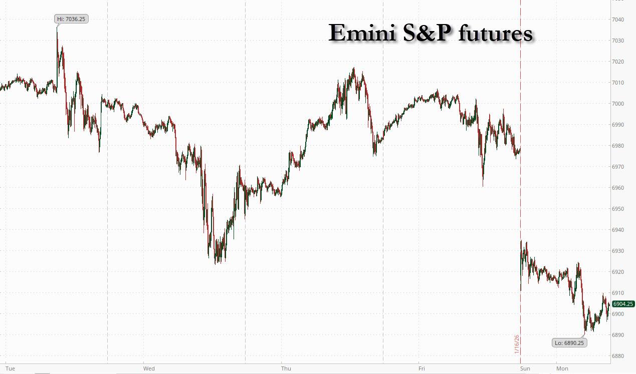 Stocks sold off, and gold hit a new record as trade tensions between the US and Europe erupted over Trump’s push to take control of Greenland (which we learn today is due to Norway's snub of Trump for the Nobel peace prize). While US cash markets are closed for the MLK holiday, S&P futures dropped 1.1% and Nasdaq futures tumbled 1.4%, while Europe's Stoxx 600 was on track for its worst day in two months led by luxury stocks and German automakers as BMW dropped 3%. The dollar retreated 0.2%, while the Swiss franc outperformed. Gold topped $4,670 an ounce. US markets are shut today for a public holiday.