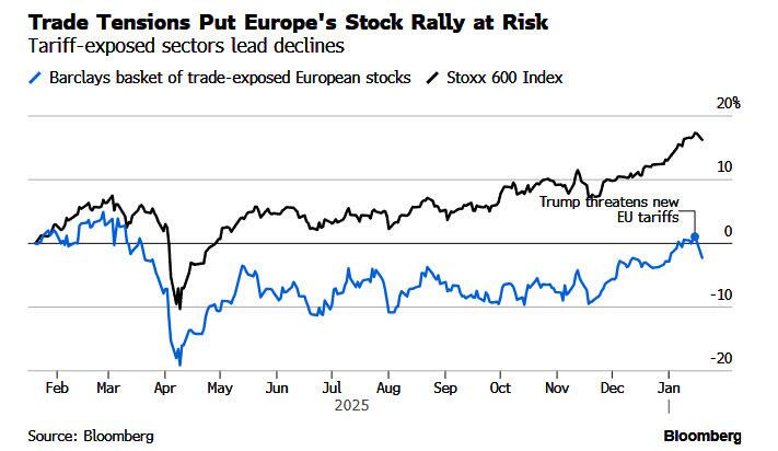 - Europe’s tariff-exposed sectors — including autos, drinks and shipping — are trading lower on Monday, after President Donald Trump announced on Saturday a new 10% levy on eight countries opposed to his plans to seize Greenland