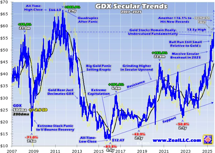 The gold miners’ epic record fundamentals support way-higher gold-stock levels, as their phenomenal Q2’25 results are reinforcing. And technically gold stocks remain way under where they should be trading based on their historical leverage to gold. So there’s massive room for them to surge much higher as new GDX records stoke excitement, bullishness, and chasing. Getting deployed before that breakout is prudent.