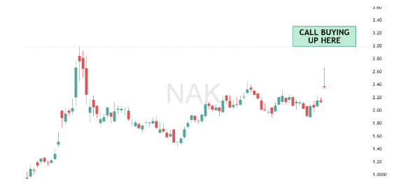 The trade setup is clean. NAK closed at $2.57. Technical breakout above $3.00 projects to $3.25-$3.75 based on the symmetrical triangle pattern. March $3.00 calls traded for $0.43. If the stock reaches $3.75, those options become worth at least $0.75. That is a double on a defined risk position.