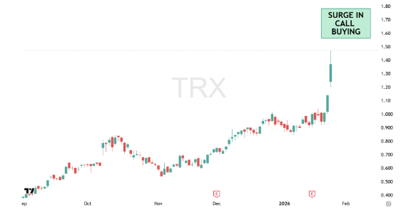 The stock broke out on Friday and continued on Monday, surging to $1.40 on the February $1.50 calls. This gold producer operates the Buckreef Project in Tanzania. The concentrated buying at one strike creates significant upside potential if TRX breaks $1.50.
