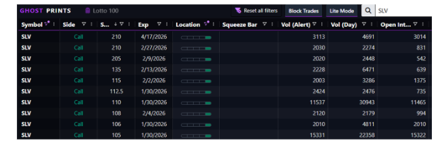 Silver showed the same pattern. Over 50,000 contracts on SLV. Buying strikes anywhere from 105 to 210. More longshot, desperate plays.