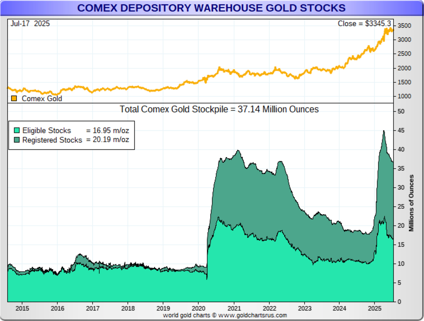 As for the COMEX gold inventories, you can see how there’s been a steady decline since 2021, which reversed last year, and then accelerated this year as gold flowed from London to New York due to the tariff uncertainty.