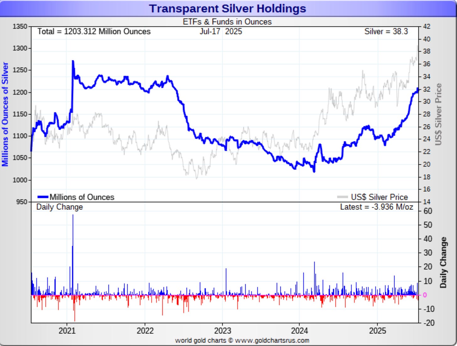 There was a similar picture in silver, where the outflows began after the Silver Squeeze of 2021, yet we’ve seen about 185 million ounces added to the ETFs since last summer.