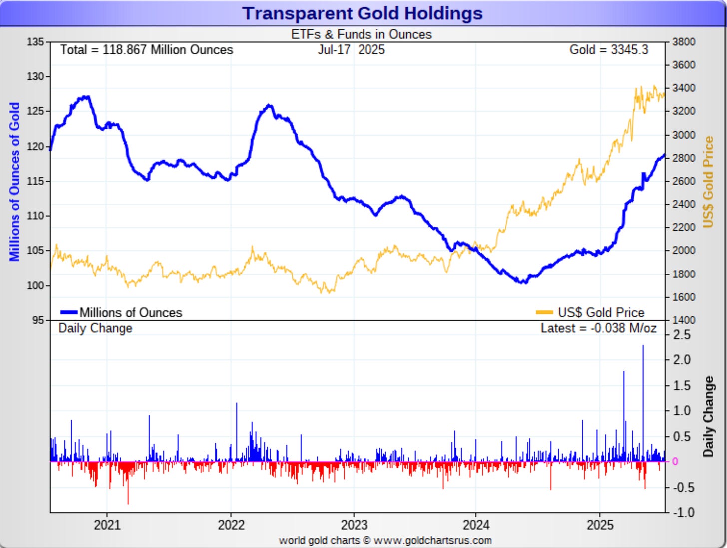 In this first one, you can see the inflows into the gold ETFs (the blue line), and how almost 18 million ounces of gold have been added since money started flowing in last summer as it became clear the Fed was getting ready to start cutting rates (there were 100 million ounces in the ETFs, and with the additions, that figure is now up to 118.857 million ounces).