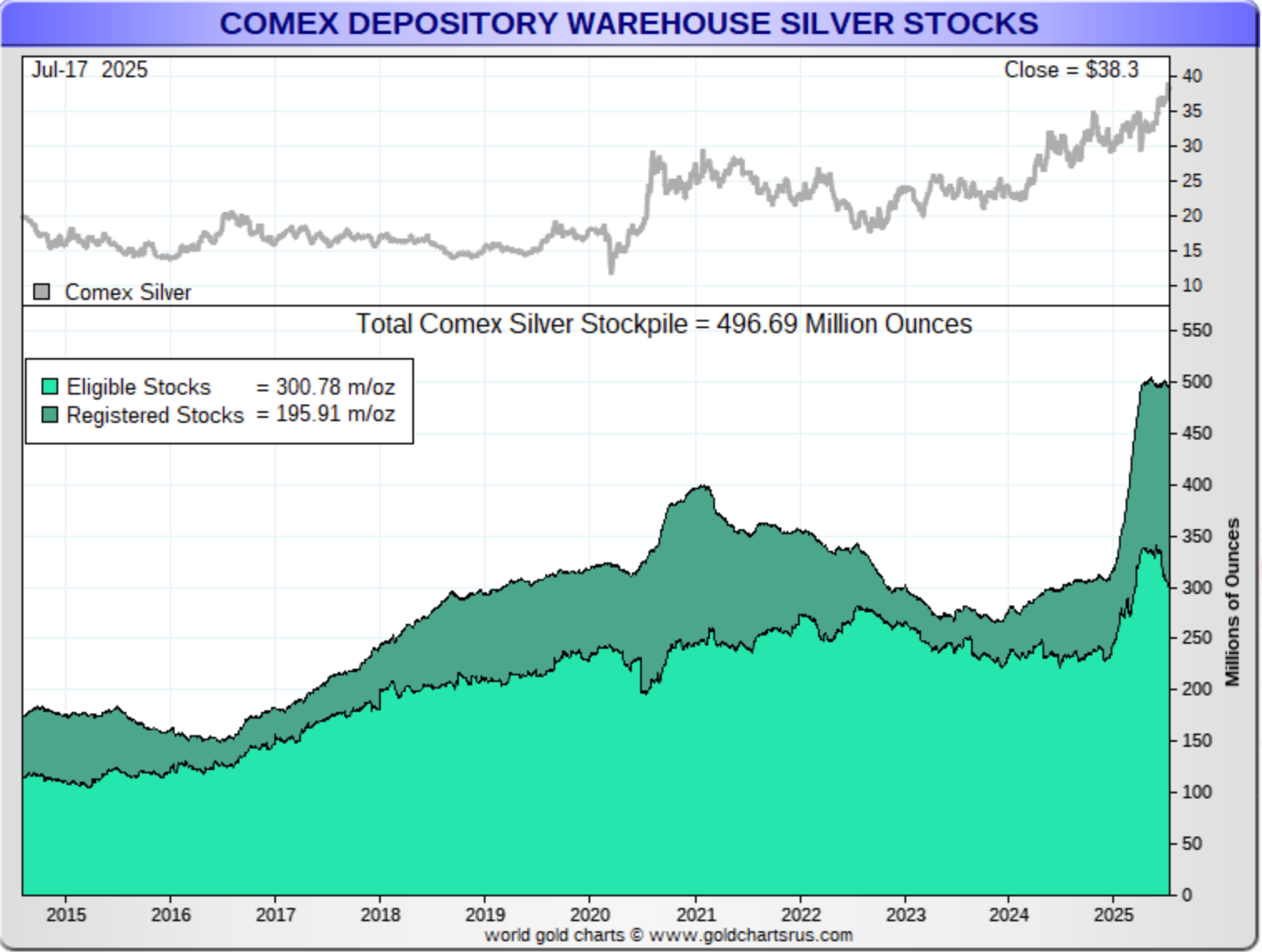 It’s a slightly different picture in silver, where metal did start leaving the COMEX vaults in 2021 and up until 2024 when silver started coming back in. Then there was the surge higher this year, although we haven’t seen the overall stockpile decrease over the past few months. Instead, we’ve seen metal flow from the eligible to registered category.