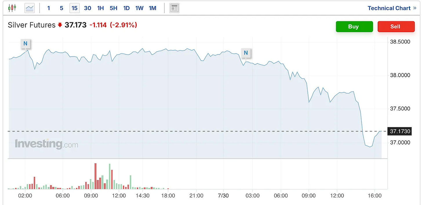 Here you can see how silver was already selling off throughout the morning and early afternoon, before it fell off a cliff following the Fed meeting, and even briefly dipped below the $37 level.