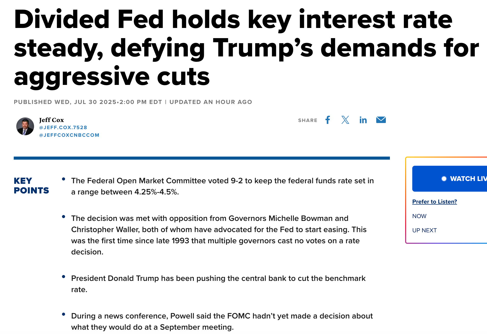 But with that aside, regardless of what Trump wanted, Jerome Powell and the Fed did not oblige this time. Of course, this makes it even more interesting to imagine what was said between Trump and Powell last week when the microphones were off. But I'm assuming that if they were to meet again in the near future, it probably wouldn't be too cuddly.
