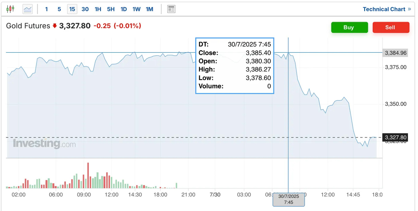 The gold futures were down $53 on the day to $3,327 (the price chart below had already reset, which is why it only shows the price being down 25 cents here).
