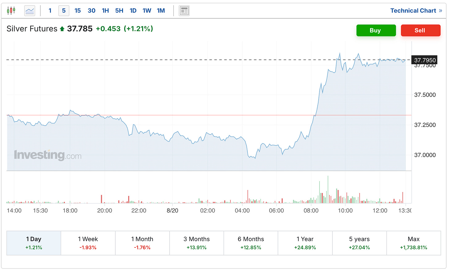Meanwhile, silver was up 45 cents, erasing most of yesterday's losses, and is currently trading at $37.78.