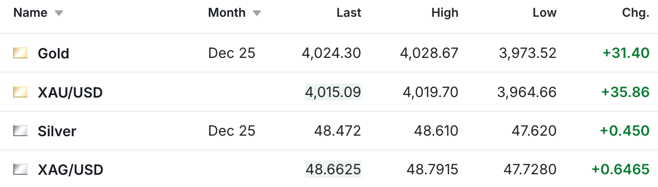 The gold and silver prices are rallying early in this Thursday session, with the gold price back over $4,000, and both the silver spot and futures prices well over $48.