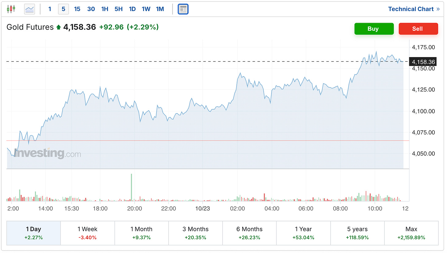 The gold futures are currently up $93 to $4,158.