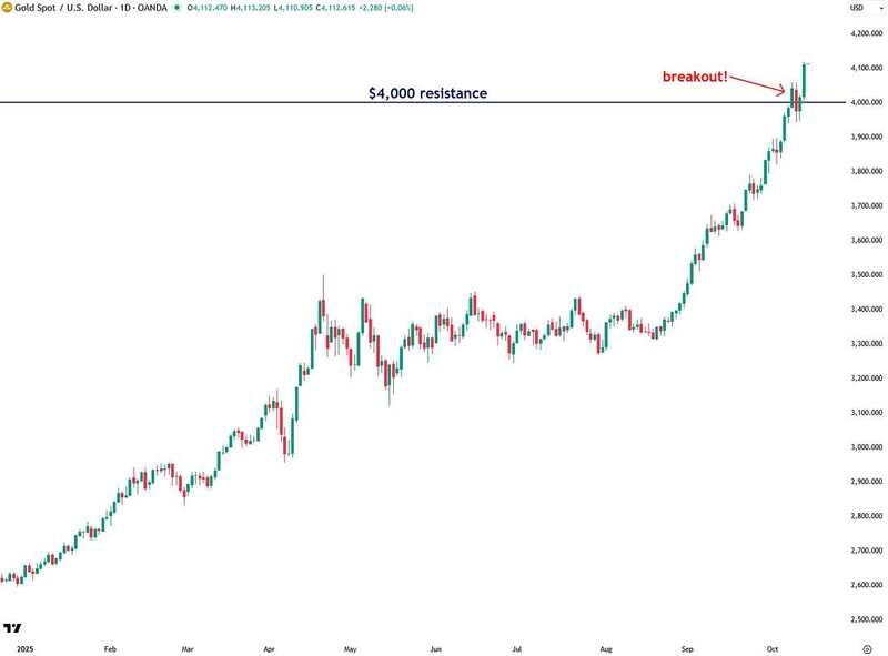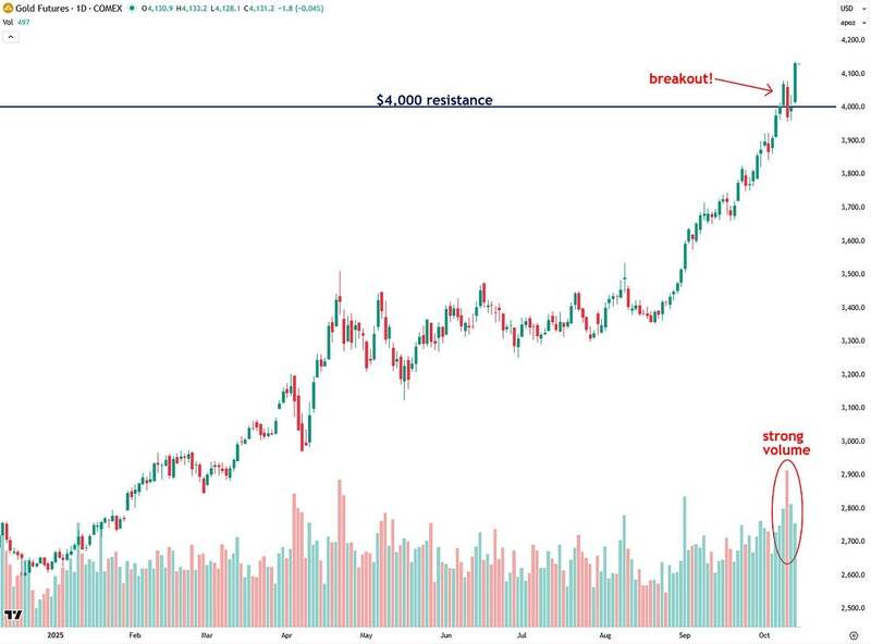 Surprisingly, however, gold showed enough strength to break through $4,000 decisively yesterday, and it did so on strong volume, which provides additional confirmation. This is a strong sign of momentum and indicates that the rally is likely to continue even higher in the near term.