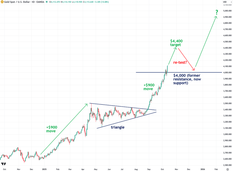 Now that gold has closed above the $4,000 level, it brings back into focus the $4,400 price target I projected all the way back on August 4, before gold had even begun its current rally.
