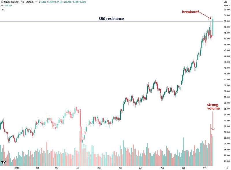 With this breakout, silver is now in blue sky territory, meaning no one who has ever bought silver is currently holding it at a loss, at least in nominal terms.