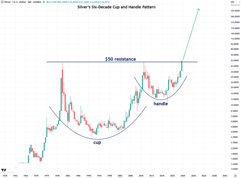 Now that silver has broken above its long-standing $50 level, it has confirmed the breakout from the massive cup-and-handle pattern that dates all the way back to the 1960s. This technical signal points to silver surging to several hundred dollars per ounce during this bull market!