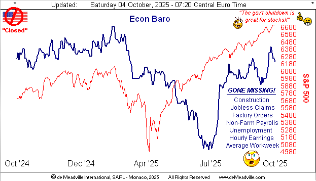 As well, you may have sensed the edginess on Gold’s sellside. This past Tuesday within a four-hour period, Gold fell -79 points, only to regain it all and then some; but again on Thursday within three hours came a drop of -81 points. The hysteria may be (as it continues to be for the S&P) that Gold is poised to go (using technical terminology) “rip-snort, el gonzo, upside nutz”. Not that it shan’t, but there’s a lot of attractive Gold trading profit for the taking these days. As certainly so there is for the S&P 500 as we go to the Economic Barometer:
