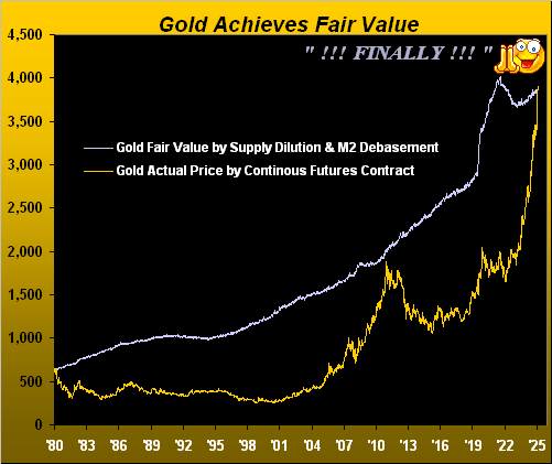 But the Big Gold Story is — for the first time arithmetically since the week ending on Halloween, 31 October 1980 (price then 642) — Gold has now eclipsed our quintessential valuation of 3867. ‘Tis thus “fair” to say Gold has finally achieved its Fair Value.