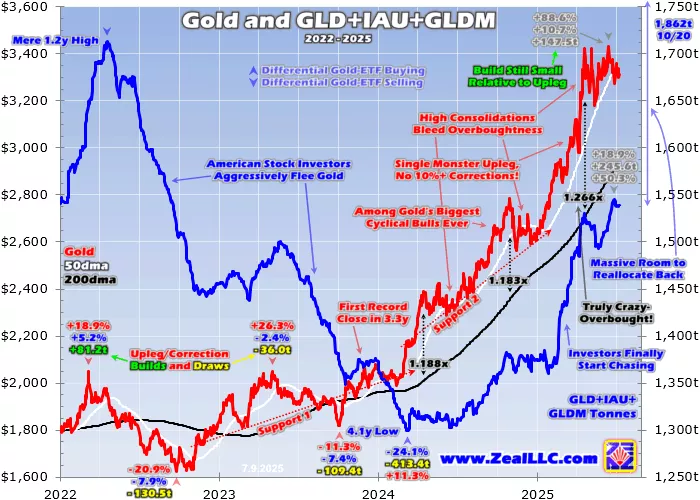Circling back a bit, American stock investors’ differential gold-ETF-share buying was sorely lacking for most of gold’s mighty cyclical bull. From early October 2023 to mid-March 2025, gold’s monster upleg had blasted 63.8% higher. Yet GLD and IAU holdings had only grown 4.4% and 2.5% during that span, or 38.2 and 10.1 metric tons. Gold’s massive gains without American stock-market-capital inflows were astounding.