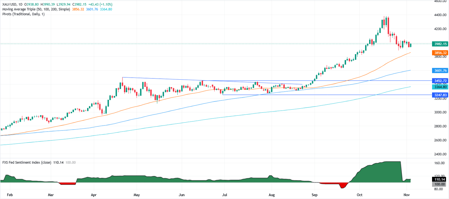 If XAU/USD climbs above $4,000, the next resistance will be the 20-day SMA at $4,082. Conversely, if Gold tumbles below the October 28 low at $3,886, sellers could challenge the 50-day SMA near $3,854.