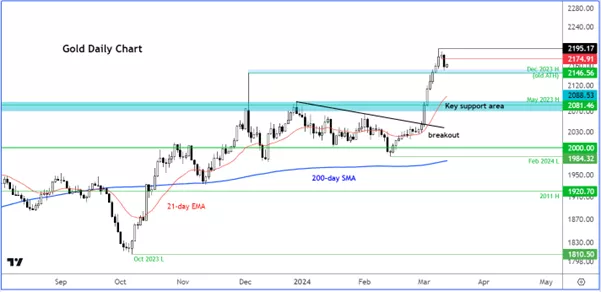 Looking at the gold chart, it was only on Friday when the metal reached a fresh record high, so there is no reason to be extremely bearish just because of a slightly above-forecast inflation print. While there is the potential for gold to weaken a bit more, key short-term support is now not too far, around $2146, which was the high made back in December. On an intraday basis, $2150 is also a key level, so there is a possibility it may not even reach $2146 before pushing higher again. Regardless, below these levels, there are even stronger support levels to watch in case we get a deeper pullback. For example, $2100 is the next round level to watch, followed by long-term support, around the $2081/88 area, which was once strong resistance on multiple occasions in the past few years. Therefore, even if gold were to weaken more in the short term, this wouldn’t necessarily be a sign that gold has topped. In fact, many investors who missed the opportunity to buy gold when it started to rally last month will be waiting to pick up short-term dips.