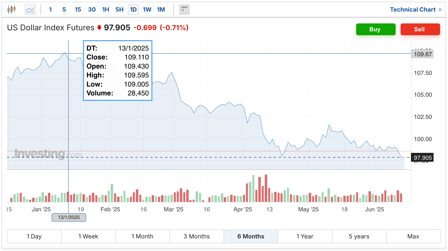 The dollar index continued what's now been a steady decline since January, when it reached over 110, and it’s now below the 98 level.