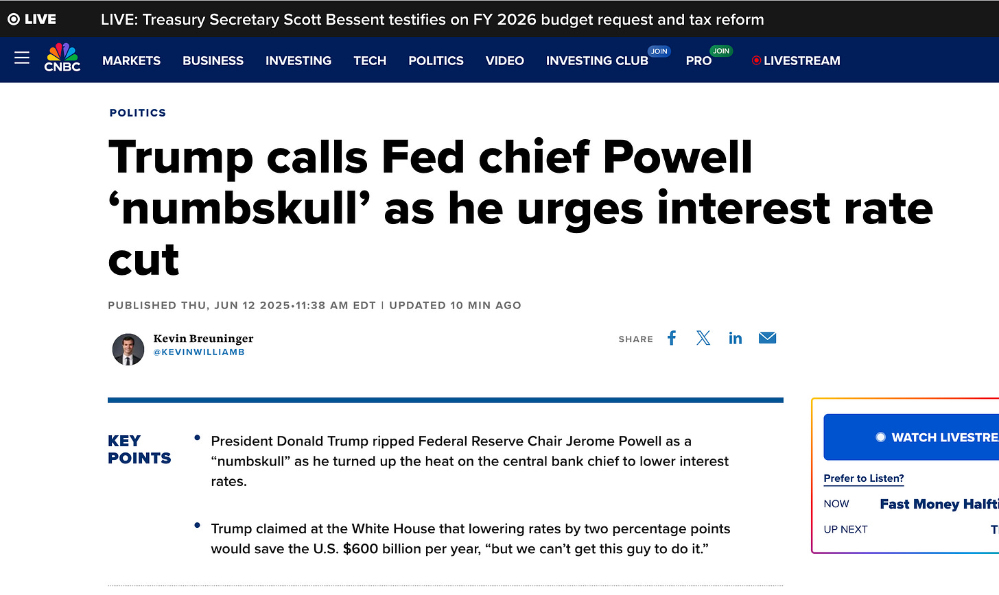 Also, that the president continues his public criticism campaign of current Federal Reserve chairman Jerome Powell, and today called him a ‘numbskull’ for not cutting rates, probably isn’t helping either.