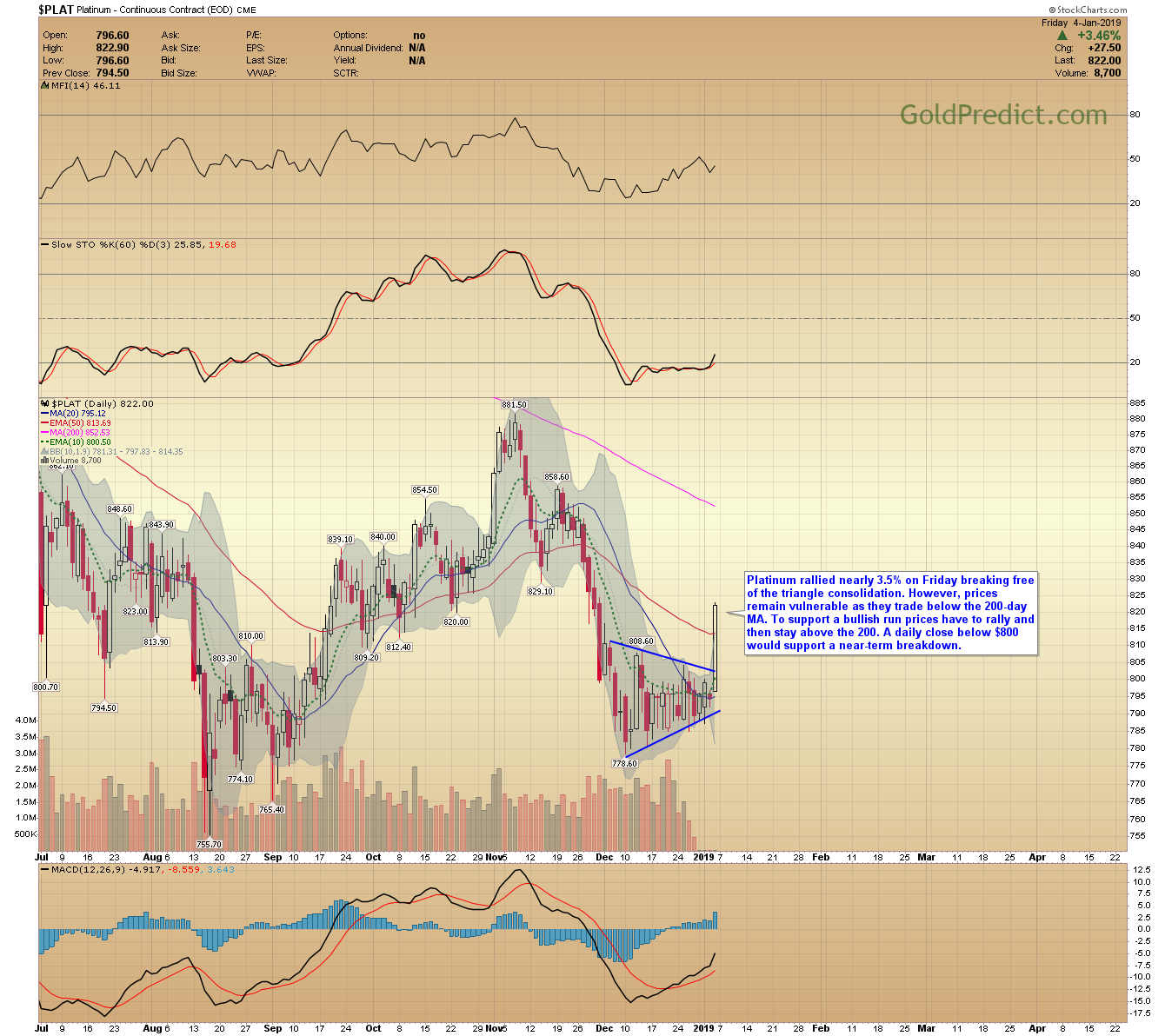 Platinum rallied nearly 3.5% on Friday breaking free of the triangle consolidation. However, prices remain vulnerable as they trade below the 200-day MA. To support a bullish run prices have to rally and then stay above the 200. A daily close below $800 would trigger a near-term breakdown.