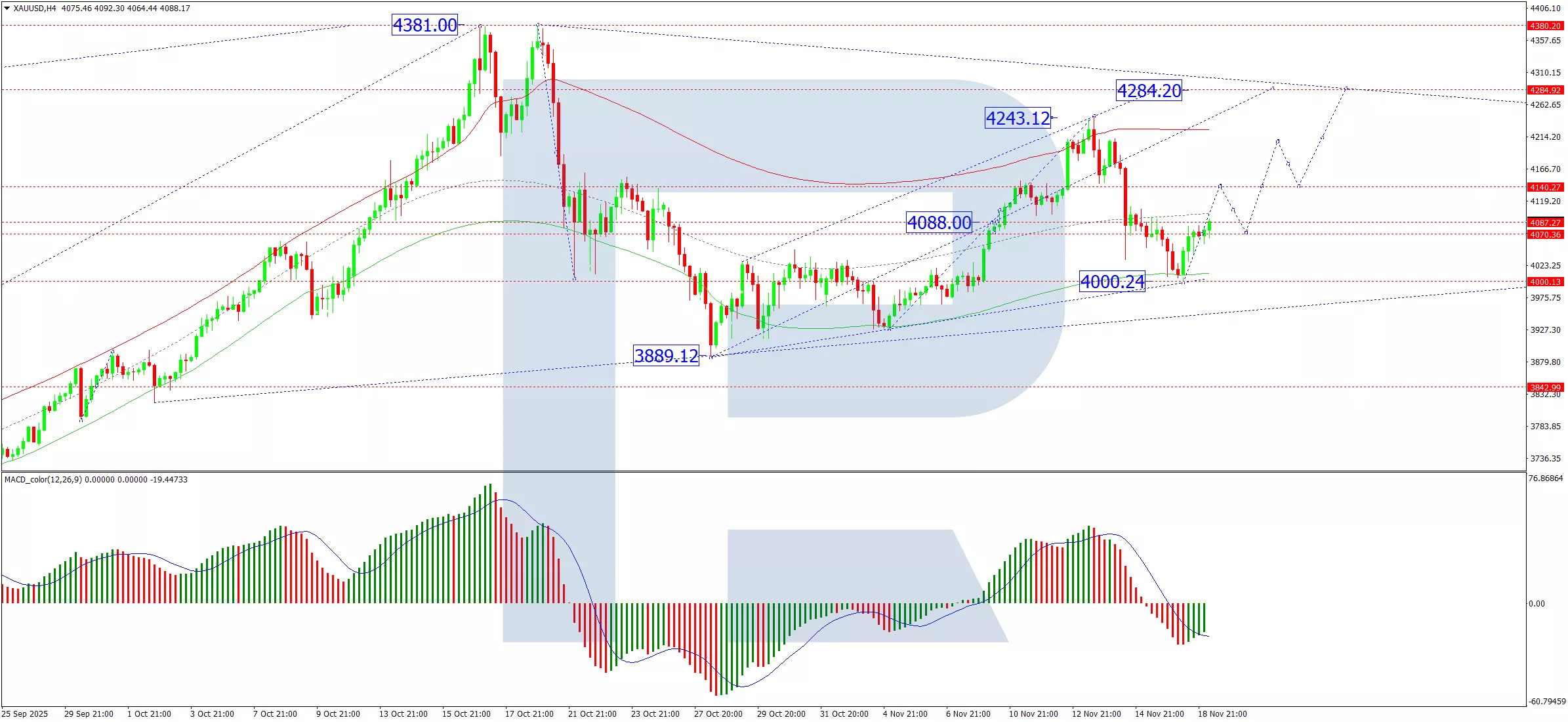 On the H4 chart, XAU/USD is forming a consolidation range around 4,060 USD. An upward breakout is anticipated, targeting 4,140 USD as part of a fifth wave within a larger growth structure aiming for 4,284 USD. The MACD indicator supports this constructive view. Its signal line is below zero but has diverged from the histogram and is turning upward, suggesting building bullish momentum.