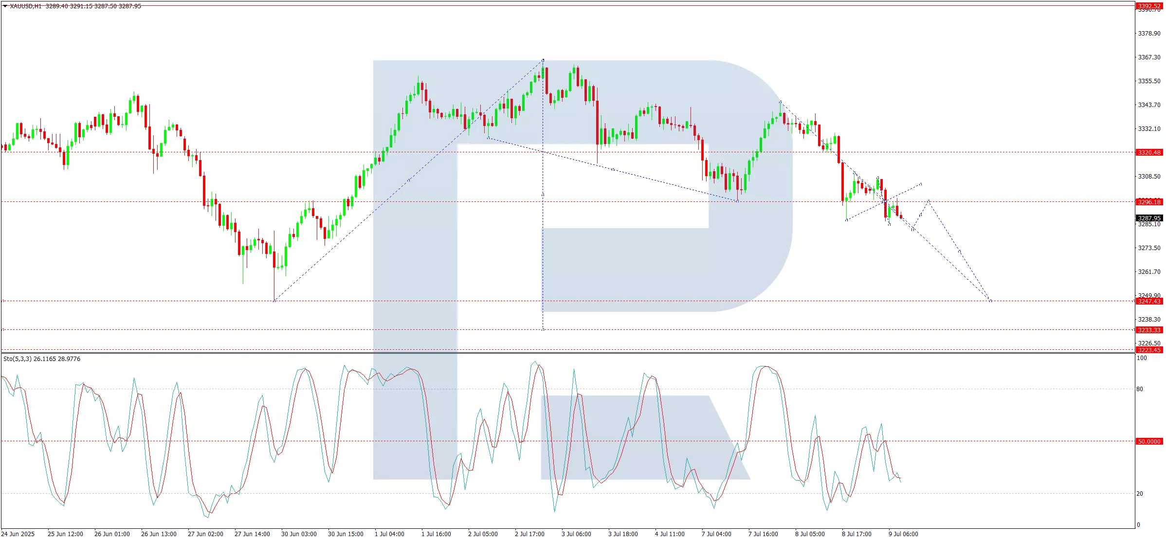 The pair has established a downward wave to 3,286, followed by a tight consolidation range near 3,296. Today, we anticipate a drop to 3,282, followed by a retest of 3,296 (from below). A breakout below this range could extend losses towards 3,247 – a near-term target. The Stochastic oscillator aligns with this view, with its signal line sitting below 50 and trending downward towards 20.